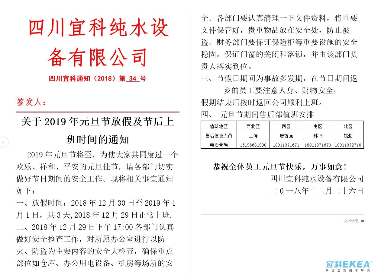 宜科放假時(shí)間:2019年2月1曰至2019年2月11曰放假及調(diào)休,共11天。2019年1月31曰(星期四)年會,2019年2月1號正常休息,2019年2月12曰正常上班、2018年2月16曰正常休息